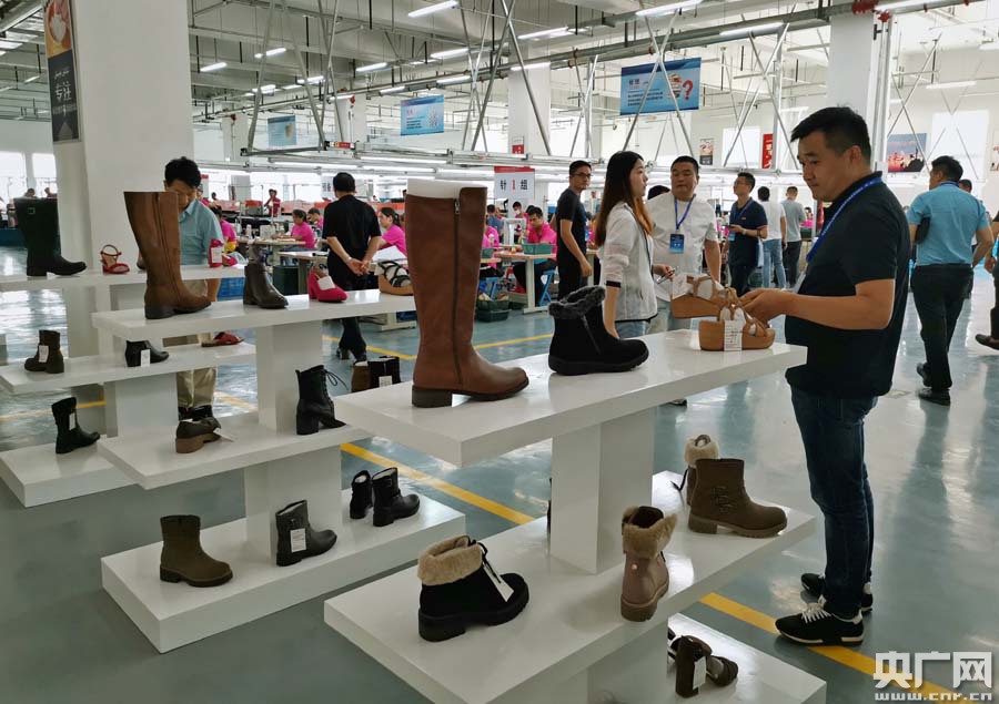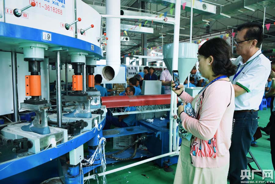與會(huì)代表考察和田制鞋企業(yè) 央廣網(wǎng)實(shí)習(xí)記者王天浩 攝