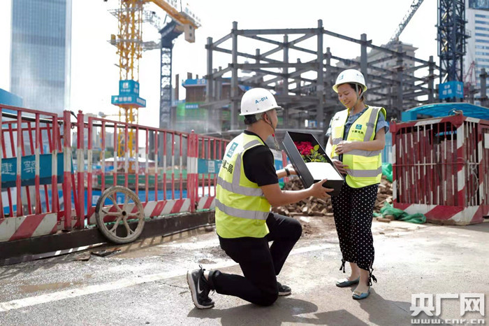 塔吊司機成忠富今年31歲,塔吊指揮何丹今年26歲,他們是一對農(nóng)民工夫妻,常年在外打工!皬臎]過過情人節(jié),這還是第一次,老婆和我在工地上吃苦卻沒給過老婆什么,感謝項目為我們搭建這難得的機會,老婆,我愛你!彼跛緳C成忠富激動的向妻子表白著,妻子何丹飽含深情地笑道,“苦不苦的無所謂,只要天天能在一起就滿足了,老公,你辛苦了!。
