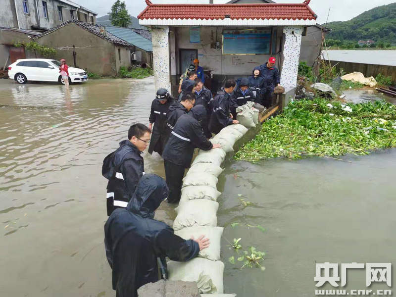 余姚市大隱鎮(zhèn)大隱學(xué)士橋村段姚江水位上漲近一公尺,搶險(xiǎn)救援人員正在筑沙袋 (央廣網(wǎng)發(fā) 余姚市委宣傳部供圖)