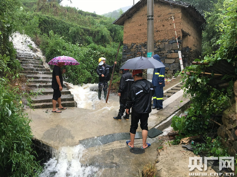 寧波市寧?h的村干部在冒雨清淤 (央廣網(wǎng)發(fā) 寧?h委宣傳部供圖)