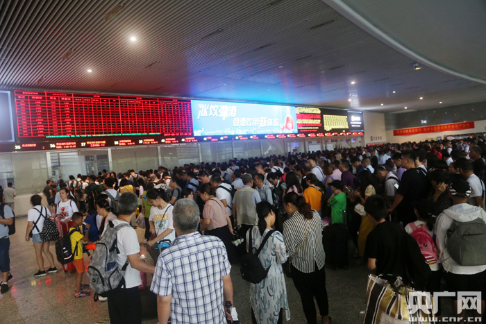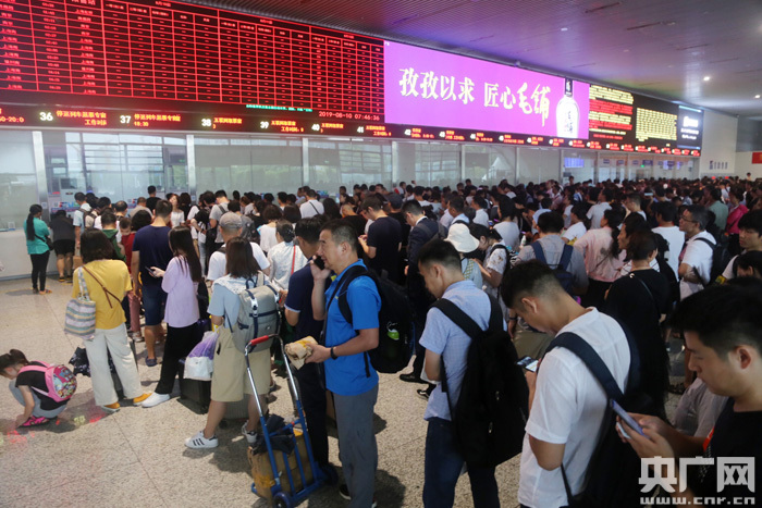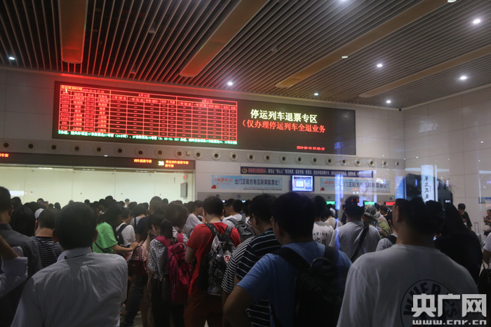 8月10日,杭州東站售票處的退票乘客人山人海。(央廣網(wǎng)記者 魏煒 攝)