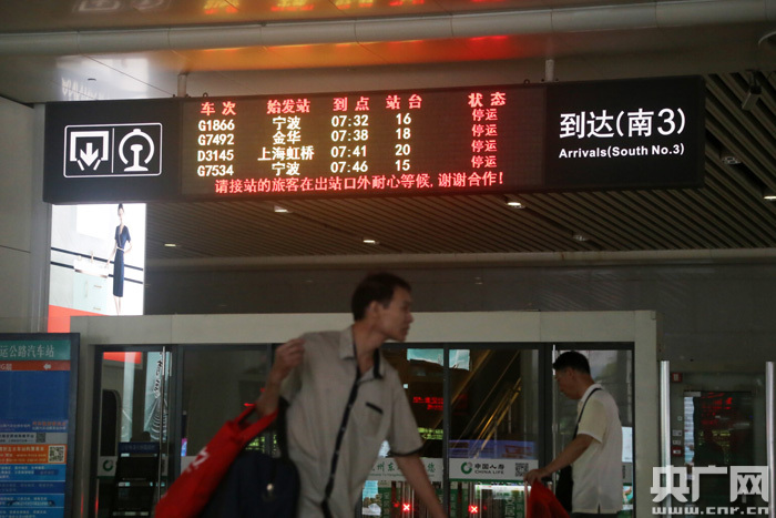 8月10日,一位乘客從杭州東站停運的電子指示牌前走過。(央廣網(wǎng)記者 魏煒 攝)