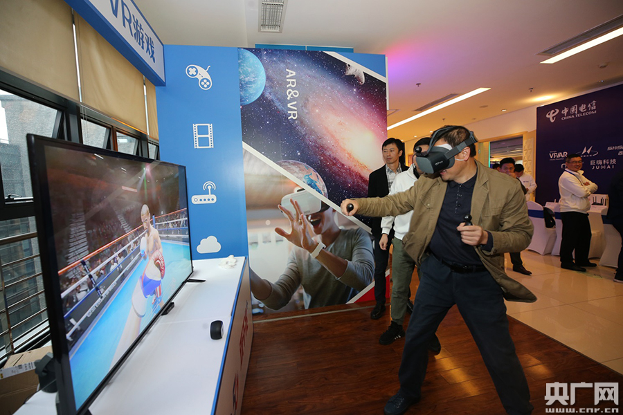 參會嘉賓體驗電信5GVR游戲(央廣網(wǎng)發(fā) 中國電信供圖)