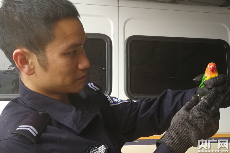 民警正在對(duì)鸚鵡進(jìn)行初步檢查(央廣網(wǎng)發(fā) 通訊員戴秋云 攝)
