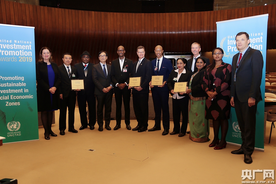 當(dāng)?shù)貢r間11月11日下午,在聯(lián)合國總部日內(nèi)瓦,廣州開發(fā)區(qū)獲得聯(lián)合國“2019年度全球杰出投資促進(jìn)機(jī)構(gòu)大獎”。圖為獲獎機(jī)構(gòu)合影。(央廣網(wǎng)發(fā) 李晶晶 攝)