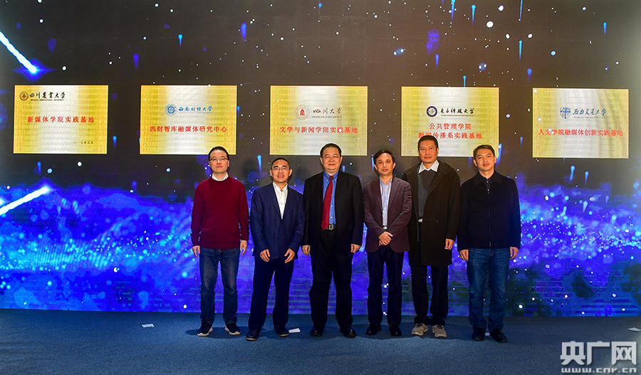 四川高校相關(guān)學(xué)院負(fù)責(zé)人給成都高新區(qū)融媒體中心授牌并合影(央廣網(wǎng)發(fā) 梁磊 攝)
