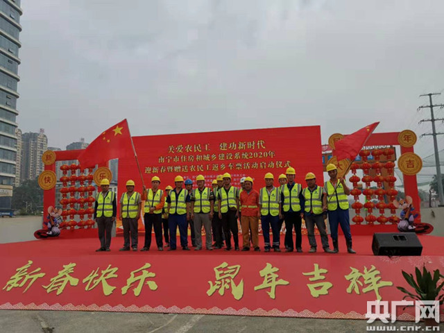 央廣網(wǎng)南寧1月9日(記者鄧君洋 通訊員梁詩菡)春節(jié)臨近,廣西南寧市住建局和市總工會不忘建筑工地一線進城務工人員,組織局機關和市建筑質(zhì)量安全管理中心、市建設工會、中建五局廣西分公司、市城鄉(xiāng)建設信息中心、南寧軌道交通集團有限責任公司、廣西運德汽車運輸集團有限公司、市建設工程質(zhì)量安全協(xié)會等企事業(yè)單位,在由中建五局廣西公司承建的地鐵5號線03標土建14工區(qū)項目部舉辦了2020年“關愛農(nóng)民工建功新時代”迎新春聯(lián)誼暨贈送農(nóng)民工返鄉(xiāng)車票活動啟動儀式。