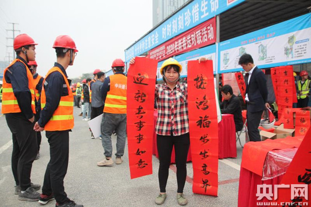 工人師傅高興地領到春聯(lián)(央廣網(wǎng)發(fā) 照片由中建五局廣西公司提供)