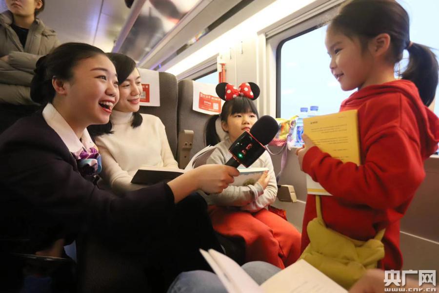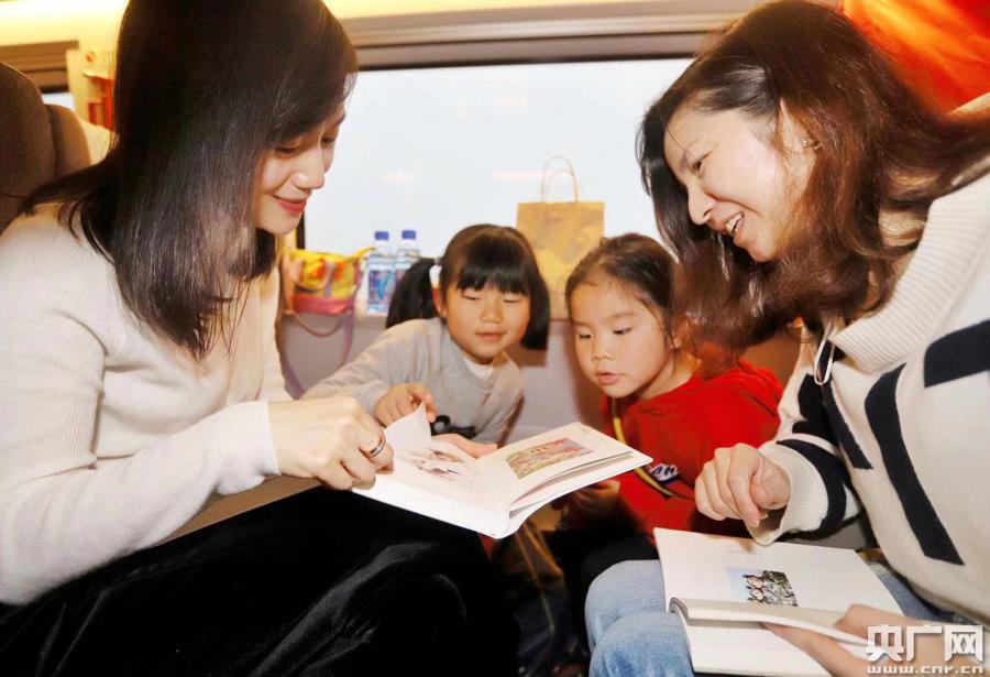 這場(chǎng)豐富多彩的圖書(shū)漂流活動(dòng)吸引了廣大旅客的踴躍加入。有旅客從前排座椅后的袋子里取出“漂流書(shū)”,并受邀翻開(kāi)書(shū)的任意一頁(yè)進(jìn)行朗誦。和朋友一起帶孩子出行的陳女士接過(guò)工作人員送上的公仔和圖書(shū),高興地說(shuō):“這次帶孩子去北京玩,很高興在火車(chē)上遇上這個(gè)活動(dòng),讓我感受到了濃濃的年味和有意義的旅途!