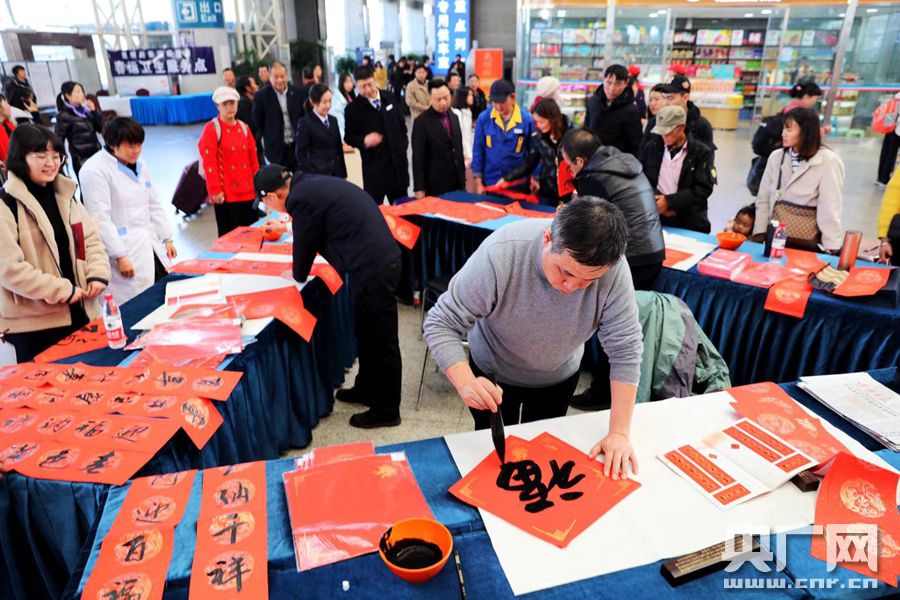 央廣網(wǎng)昆明1月11日消息(記者李健飛 通訊員鄧瑜 楊紫軒)1月10日9時30分,在昆明站候車大廳一個三角形的展臺前,吸引了很多旅客駐足觀看,來自中國鐵路昆明局集團(tuán)的書法愛好者正在為旅客寫春聯(lián)、送福字;隨后9時46分在優(yōu)美的音樂聲中,及主持人的介紹下,昆明局集團(tuán)2020年春運(yùn)“送萬福 進(jìn)萬家”“美好春運(yùn) 金花相伴”主題服務(wù)等活動在昆明站候車大廳拉開序幕。來自中國鐵路昆明局集團(tuán)昆明客運(yùn)段、昆明機(jī)務(wù)段、昆明站的鐵路職工在車站及部分列車上用自己的歌舞、技能表演,新老乘務(wù)員春運(yùn)工作交接等形式為旅客展示鐵路職工不一樣的春運(yùn)服務(wù)風(fēng)貌。