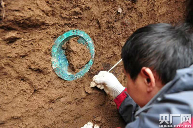 考古人員正在出土文物(央廣網(wǎng)發(fā) 寶雞市考古研究所供圖)