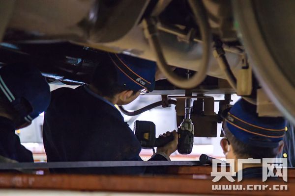 成都動車段青年骨干在動車組車底進(jìn)行檢修作業(yè)(央廣網(wǎng)發(fā) 通訊員供圖)
