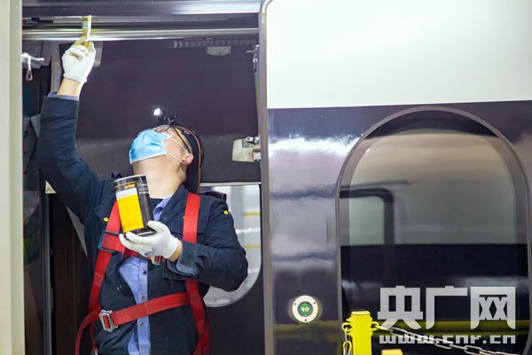 成都動車段青年骨干對動車組車門進(jìn)行維護(hù)(央廣網(wǎng)發(fā) 通訊員供圖)