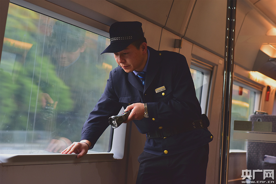 在萬州北站站臺(tái)上,薛稀吉日拿著攝像手電筒,仔細(xì)檢查車體外觀的每個(gè)關(guān)鍵部位,有時(shí)候還會(huì)稍作停頓,手指口呼確認(rèn)狀態(tài)。他介紹到這是巡檢過程中的重要標(biāo)準(zhǔn),檢查動(dòng)車組重要部件時(shí)必須做到“必指、必呼、必看”,手指關(guān)鍵部位、口呼部件名稱及狀態(tài)、眼看部件狀態(tài),確!笆值、眼到、心到”,確保不漏看、不錯(cuò)看。