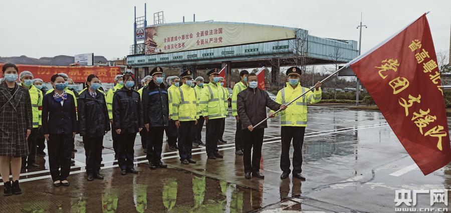 2月4日中午,在連綿冷雨中的粵北省界,開陽高速路政大隊副大隊長許佳生接過鮮紅的“疫情防控黨團支援隊”旗幟,在他身后的隊員們共同舉手宣誓:“聽從指揮,積極行動,堅決守好廣東北大門!打贏疫情防控阻擊戰(zhàn)!”他們是廣東省高速公路有限公司從各高速路段抽調(diào)派赴粵北增援防疫工作的第一批10名隊員,隨行而來的還有消毒酒精、手套、口罩等一批防疫物資。