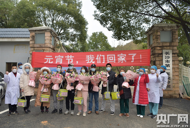 長(zhǎng)沙市公共衛(wèi)生救治中心醫(yī)護(hù)人員為8名出院患者贈(zèng)送鮮花和元宵,為他們康復(fù)出院、合家團(tuán)聚送上衷心的祝福(央廣網(wǎng)發(fā) 通訊員潘艷 攝)