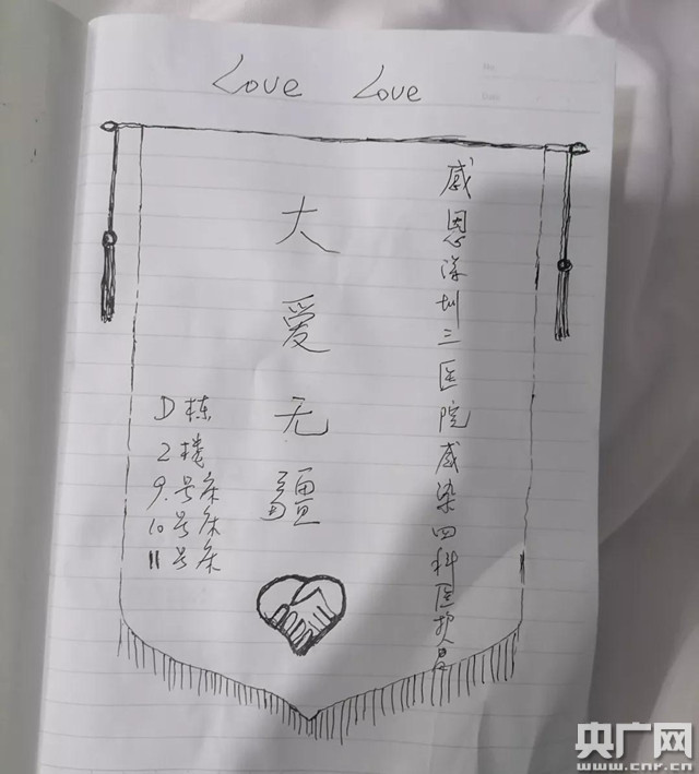 怕孩子們孤單,護士們還會多些時間停留在病房里,陪孩子們看動畫片、給他們講故事、和他們做手工。這些點點滴滴小孩子都看在眼里。那天,在鐘艷護士陪孩子做完手工后,這位小女孩用稚嫩的筆畫寫下了對醫(yī)護人員的愛。