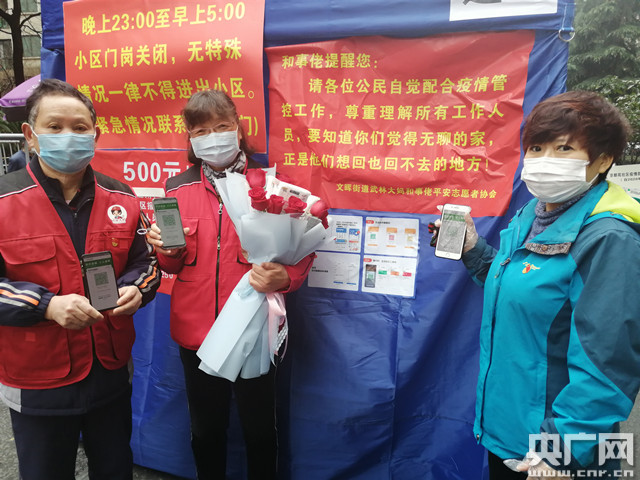10點28分,徐大姐正在尋找下一位需要幫助介紹健康碼的居民,忽然,一大捧鮮花冷不丁遞了過來,把徐大姐嚇了一跳,仔細一看,原來是老伴陶師傅!鞍,你不是說出去買菜?”徐大姐笑著“責怪”著陶師傅。