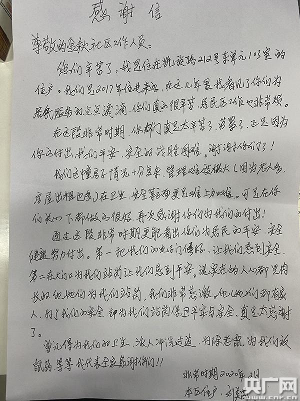 央廣網杭州2月16日消息(記者魏煒 通訊員高宇)“說實在的,人心都是肉長的,他們?yōu)槲覀冋緧彛覀兎浅8屑!他們都有家人,為了我們的安全,卻為我們站崗保衛(wèi)平安與安全,真的太感謝了!”近日,江干區(qū)凱旋街道金秋花園社區(qū)收到了一封社區(qū)居民送來的感謝信。雖然只是薄薄的一張紙,但滿滿紙面的文字勝過千言萬語,這是居民群眾對社區(qū)工作的認可和肯定。這一份心意被分享在社區(qū)工作群中,讓身在“前方”和“后方”的大家都備受鼓舞。