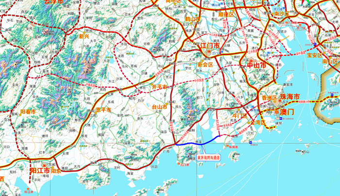 黃茅?绾Mǖ理椖渴腔浉郯拇鬄硡^(qū)重點工程,項目起點位于珠海市高欄港區(qū),東連港珠澳大橋,西連新臺高速并與西部沿海高速相交,終點位于臺山市斗山鎮(zhèn)。全長約31公里項目,全線采用雙向6車道高速公路標準建設(shè),設(shè)計時速100公里/小時。