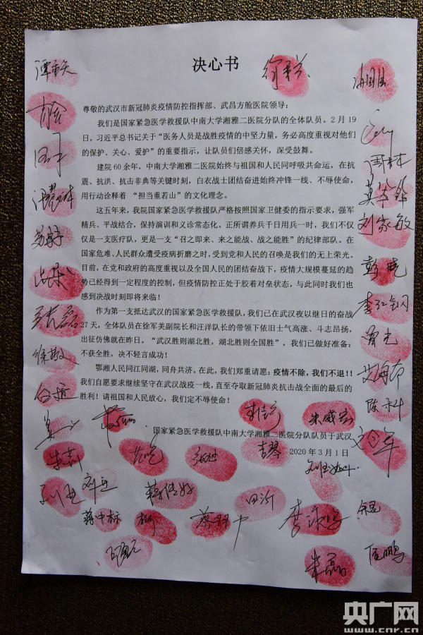 3月1日上午,湘雅二醫(yī)院援武漢武昌方艙醫(yī)院醫(yī)療隊(duì)全體成員一致立下決心書,以徐軍美副院長為首的42名隊(duì)員在上面簽名并按下了鮮紅的手印。