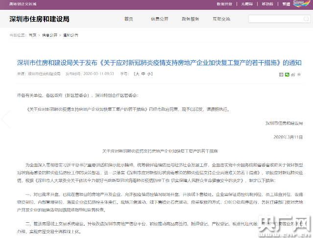 深圳市住房建設(shè)局出臺了《關(guān)于應(yīng)對新冠肺炎疫情 支持房地產(chǎn)企業(yè)加快復(fù)工復(fù)產(chǎn)的若干措施》(央廣網(wǎng)發(fā) 來自深圳住建局官網(wǎng))