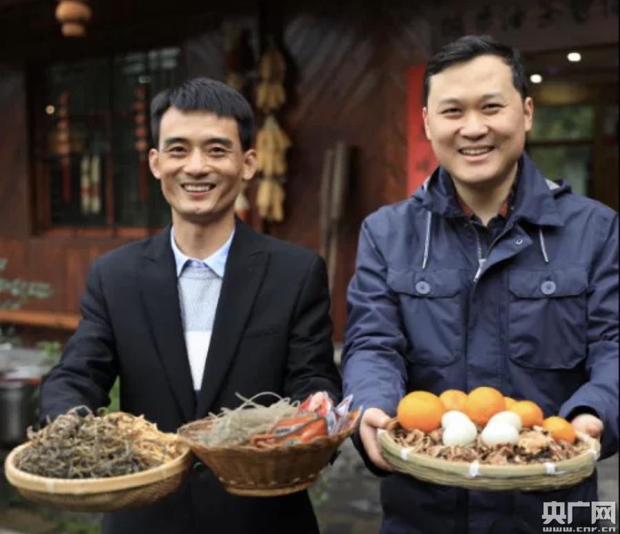 邵陽(yáng)城步縣副縣長(zhǎng)劉書軍(右)當(dāng)起“主播”推銷當(dāng)?shù)剞r(nóng)特產(chǎn)品(央廣網(wǎng)發(fā) 城步縣政府供圖)