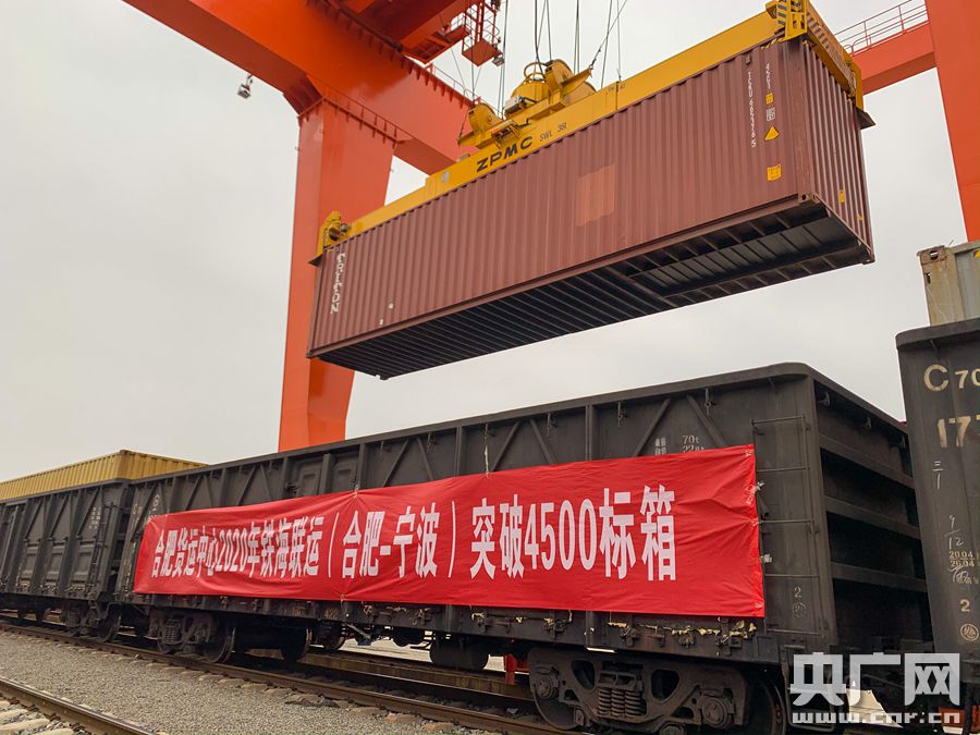 合肥貨運中心2020年鐵海聯(lián)運(合肥-寧波)第4500標(biāo)準(zhǔn)箱裝車(央廣網(wǎng)發(fā) 通訊員供圖)