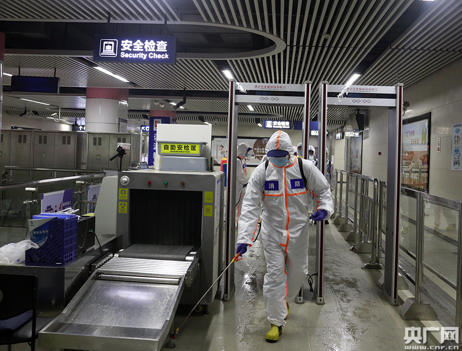 3月26日,在武漢地鐵光谷廣場(chǎng)站內(nèi),消防員正在對(duì)該站安檢區(qū)域進(jìn)行全面消殺(央廣網(wǎng)發(fā) 通訊員王方 攝)