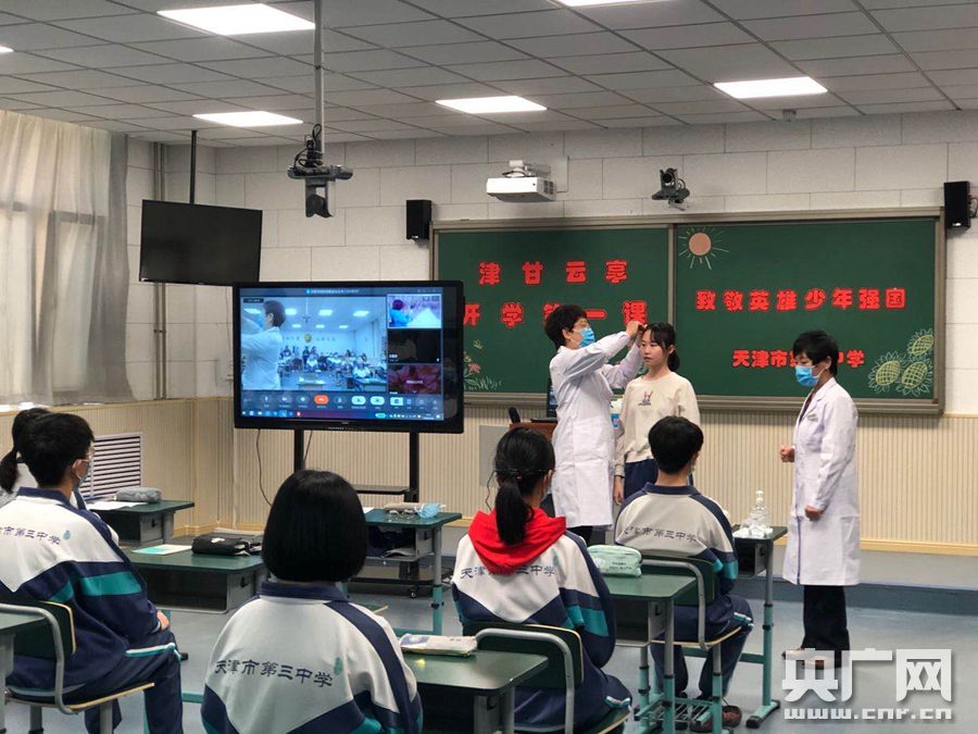 一線醫(yī)務(wù)人員為天津三中學(xué)生講解抗議知識(央廣網(wǎng)記者 夏震宇 攝)