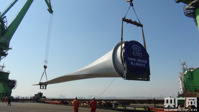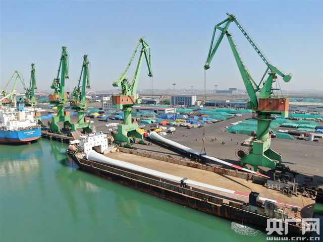 我國首套10兆瓦海上風電葉片在天津港順利裝船(央廣網發(fā) 天津港供圖)
