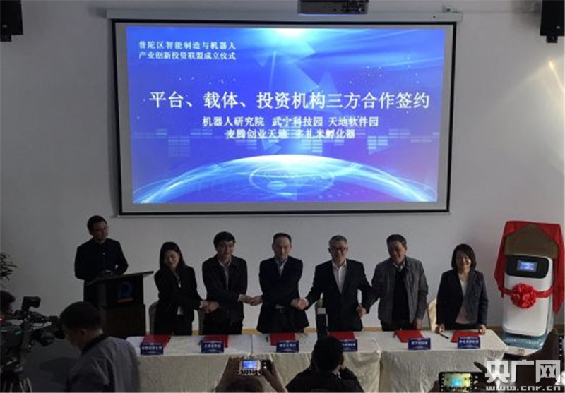 儀式上,普陀區(qū)科委黨組書(shū)記、主任李文波和普陀區(qū)智能制造與機(jī)器人產(chǎn)業(yè)創(chuàng)新投資聯(lián)盟理事長(zhǎng)、上海普陀科技投資有限公司總經(jīng)理陳很榮共同為普陀區(qū)智能制造與機(jī)器人產(chǎn)業(yè)創(chuàng)新投資聯(lián)盟揭牌。上海機(jī)器人產(chǎn)業(yè)技術(shù)研究院院長(zhǎng)鄭軍奇介紹了上海機(jī)器人研發(fā)與轉(zhuǎn)化功能型平臺(tái)建設(shè)情況,并與投資聯(lián)盟、天地軟件園等合作機(jī)構(gòu)代表簽約。