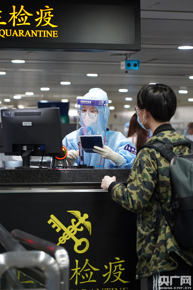 廣州海關所屬廣州白云機場海關關員掃描旅客檔案條碼錄入體溫檢測結果(央廣網發(fā) 邵子成 攝)