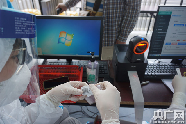 廣州海關所屬廣州白云機場海關關員打印旅客檔案條碼所關聯(lián)的標簽并粘貼在旅客鼻咽拭子樣本管上(央廣網發(fā) 陳喬 攝)