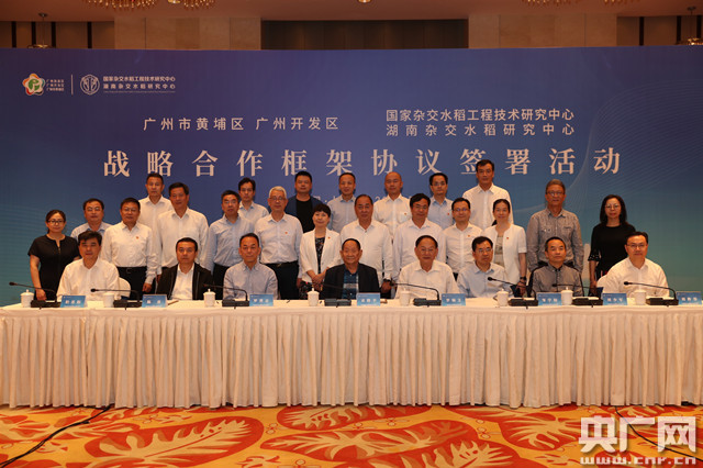 廣州市黃埔區(qū)、廣州開(kāi)發(fā)區(qū)與國(guó)家雜交水稻工程技術(shù)研究中心-湖南雜交水稻研究中心簽署戰(zhàn)略合作框架協(xié)議。(央廣網(wǎng)發(fā)李建均 方偉文 攝 )