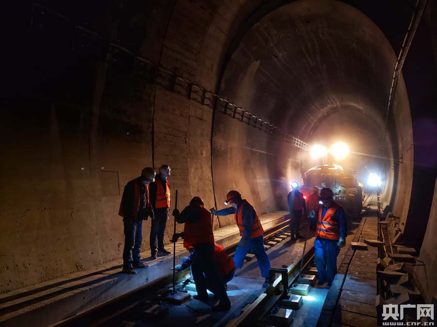 格庫鐵路最長隧阿爾金山隧道鋪軌現(xiàn)場(央廣網(wǎng)發(fā) 穆志鵬 攝)