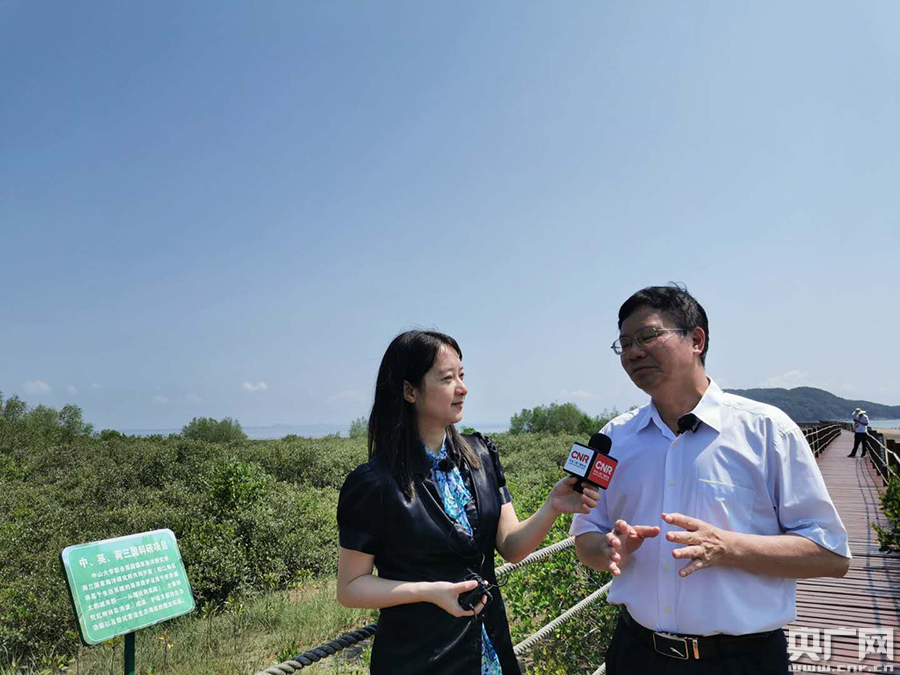 在廣東海陵島紅樹林國家濕地公園,陽江市自然資源局黨組成員、副局長葉試向總臺央廣記者介紹紅樹林保護情況(央廣網發(fā) 黃華坤 攝)