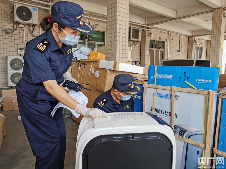 △廣州海關(guān)所屬佛山海關(guān)駐順德辦事處關(guān)員對(duì)市場(chǎng)采購(gòu)出口貨物進(jìn)行現(xiàn)場(chǎng)查驗(yàn)(央廣網(wǎng)發(fā) 石靖輝 攝)