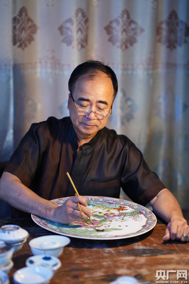 譚廣輝正在創(chuàng)作廣彩(央廣網(wǎng)記者 官文清 攝)
