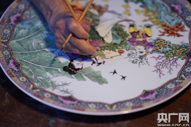 “廣彩的第一個特點是用金非常多,每件作品不單只在色彩上用金,人物的服飾用上金,圖案用上金,還有在沿邊也封上金,塑造一種‘金鑲玉’的效果!弊T廣輝指出,除此之外,廣彩的另一大特色便是綠色,與景德鎮(zhèn)的彩、潮彩和湖南醴陵彩相比,廣彩的綠色顯得特別“翠”。