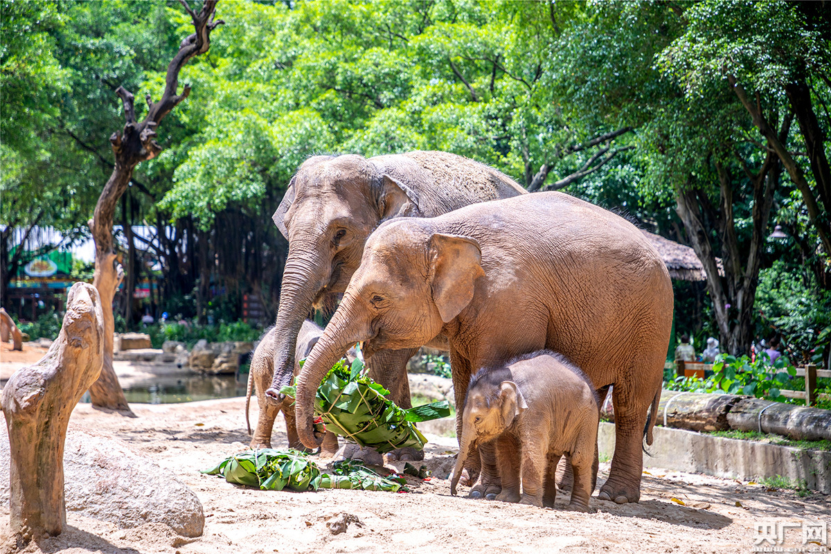 體型最大的亞洲象,粽子的體積最大,種類也最多,分成樹(shù)葉和水果粽子兩種,水果粽子里有西瓜、哈密瓜、火龍果等。只見(jiàn)今年4月30日和5月12日分別生下小象的母象“莉娜”和“伊拉”先把粽子踩碎再采食,還在喝奶的小象兄妹則在一旁玩耍,好不愜意。