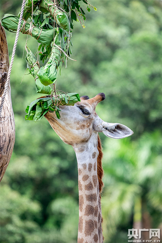 長(zhǎng)頸鹿的粽子里則是桑葉,掛在高高的樹(shù)枝上,長(zhǎng)頸鹿舔著長(zhǎng)長(zhǎng)的舌頭,吃得津津有味。