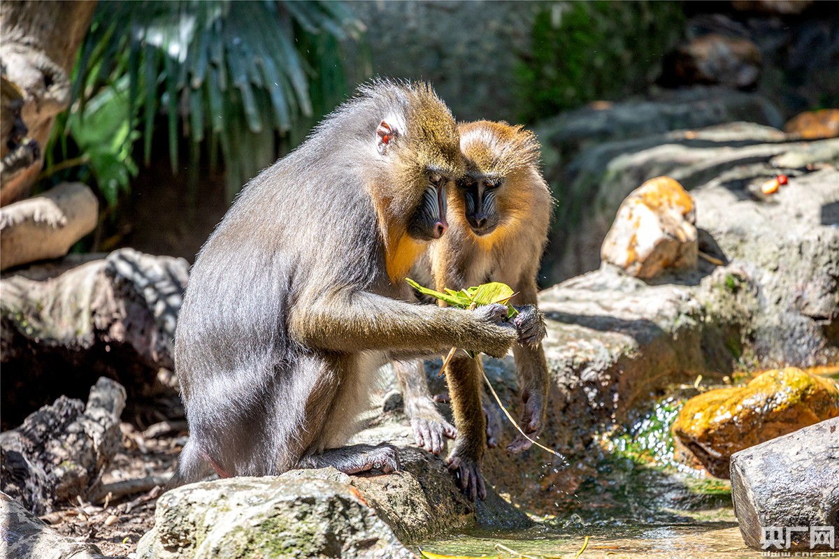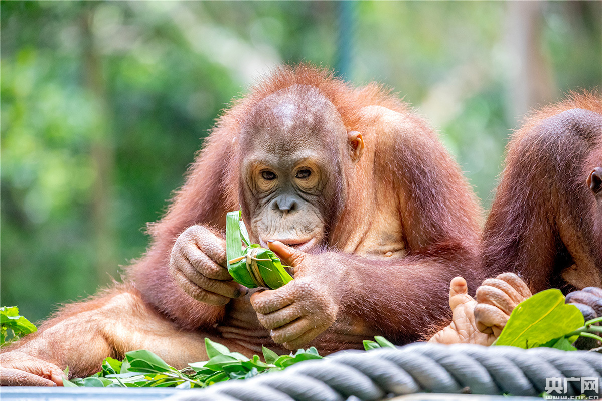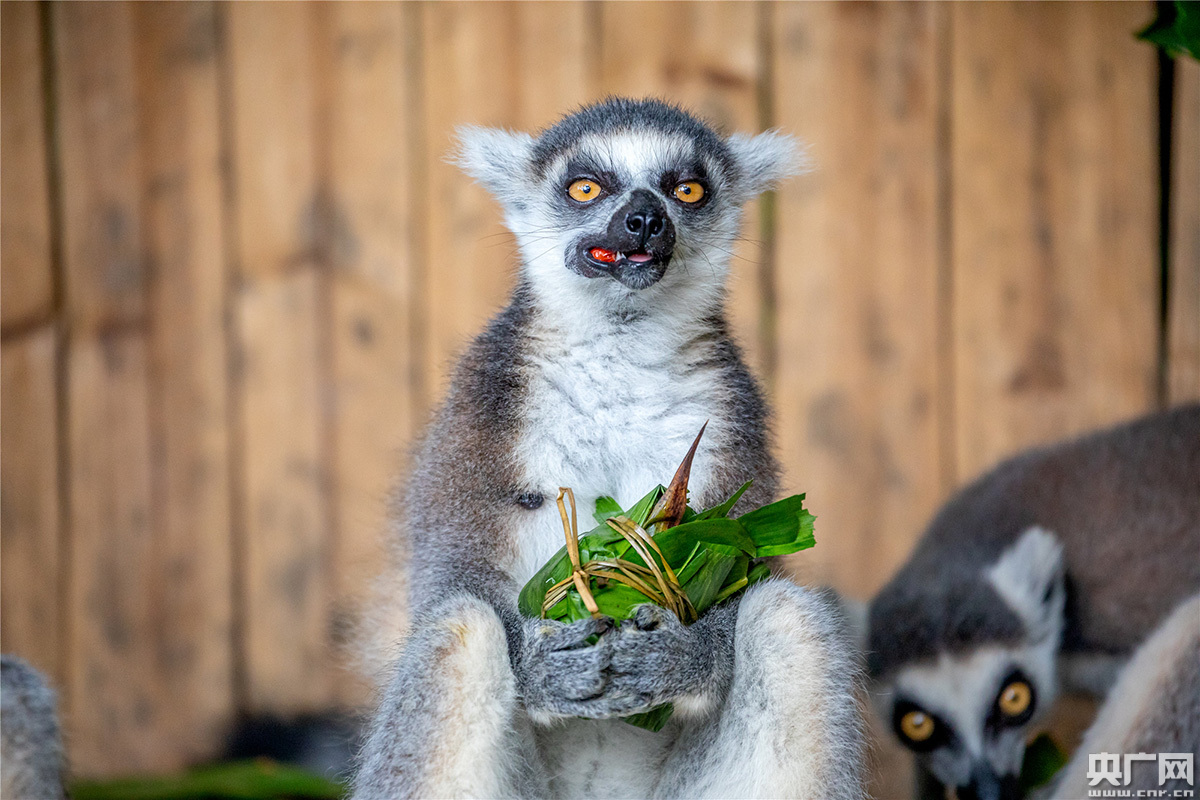 黃猩猩、山魈和節(jié)尾狐猴等靈長(zhǎng)類動(dòng)物的粽子里主要是蘋(píng)果、圣女果、香蕉、胡蘿卜、紅棗等蔬果,只見(jiàn)它們都非常靈活地剝開(kāi)粽子,享受這頓端午節(jié)蔬果大餐。