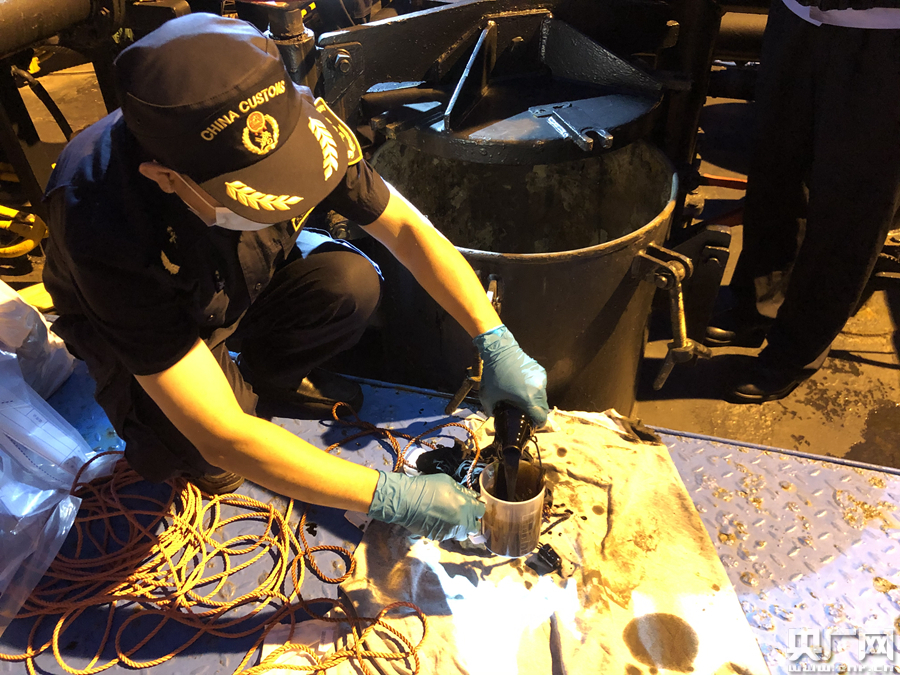 圖為深圳海關(guān)工業(yè)品檢測(cè)技術(shù)中心人員在深圳鹽田港碼頭在油污水卸載船上提取樣品 唐佳偉 攝