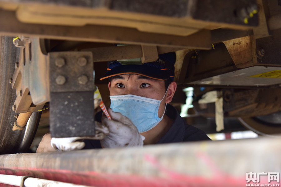 重慶北動車所動車機械師正大為動車組涂打防松標記(央廣網(wǎng)發(fā) 通訊員陳亞 攝)