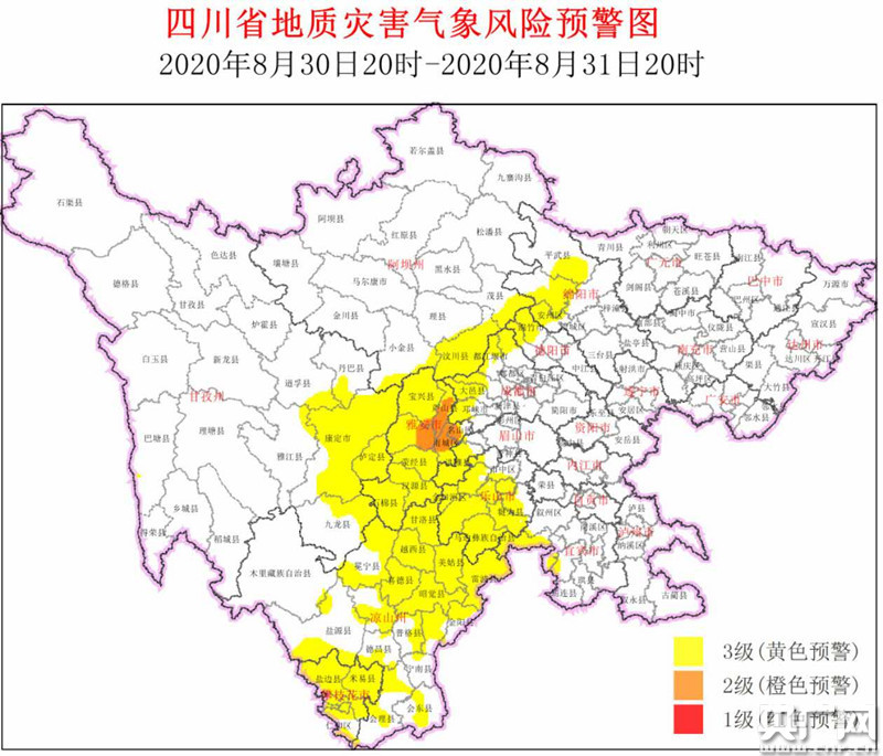 央廣網(wǎng)成都8月30日消息(記者劉濤)結(jié)合四川省氣象臺(tái)天氣預(yù)報(bào)情況,四川省地質(zhì)災(zāi)害指揮部辦公室發(fā)布8月30日20時(shí)~8月31日20時(shí),四川全省2級(jí)橙色和3級(jí)黃色地質(zhì)災(zāi)害氣象風(fēng)險(xiǎn)預(yù)警。