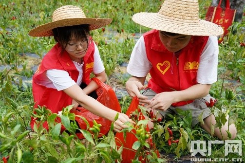 志愿者采摘辣椒(央廣網(wǎng)發(fā) 鄧仕華 攝)