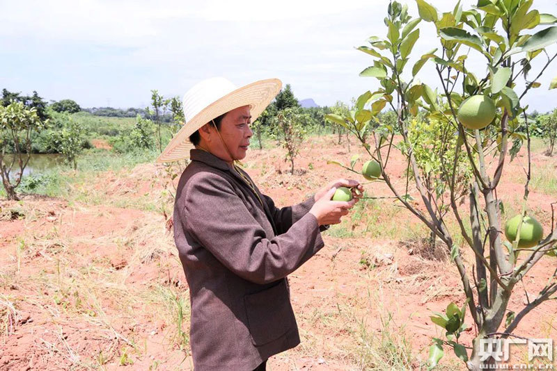 貧困戶鄒奀仙在為馬家柚摘掉長勢過密的果實(央廣網(wǎng)發(fā) 通訊員供圖)