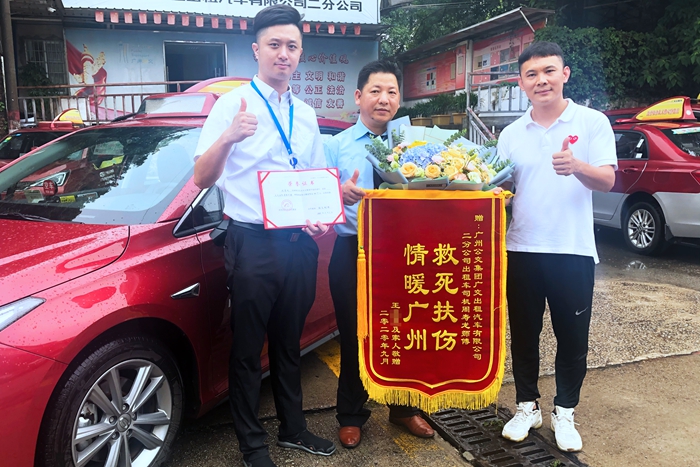 9月4日上午,康復(fù)出院的車主王先生親自來到白云(廣交)公司,向救了自己性命的“的哥”周壽龍贈(zèng)與一面繡有“救死扶傷 情暖廣州”的鮮紅錦旗,并再三致謝!王先生緊緊握著周壽龍的雙手,激動(dòng)地說:“當(dāng)時(shí)我心臟病發(fā)作,連大聲呼喊救命都叫不出來,然而,我只能眼睜睜地看著一輛輛車從旁開過,那時(shí)的感覺,真的很慌、很害怕、很無助……幸好遇到了周師傅!您真是我的救命恩人啊!”
