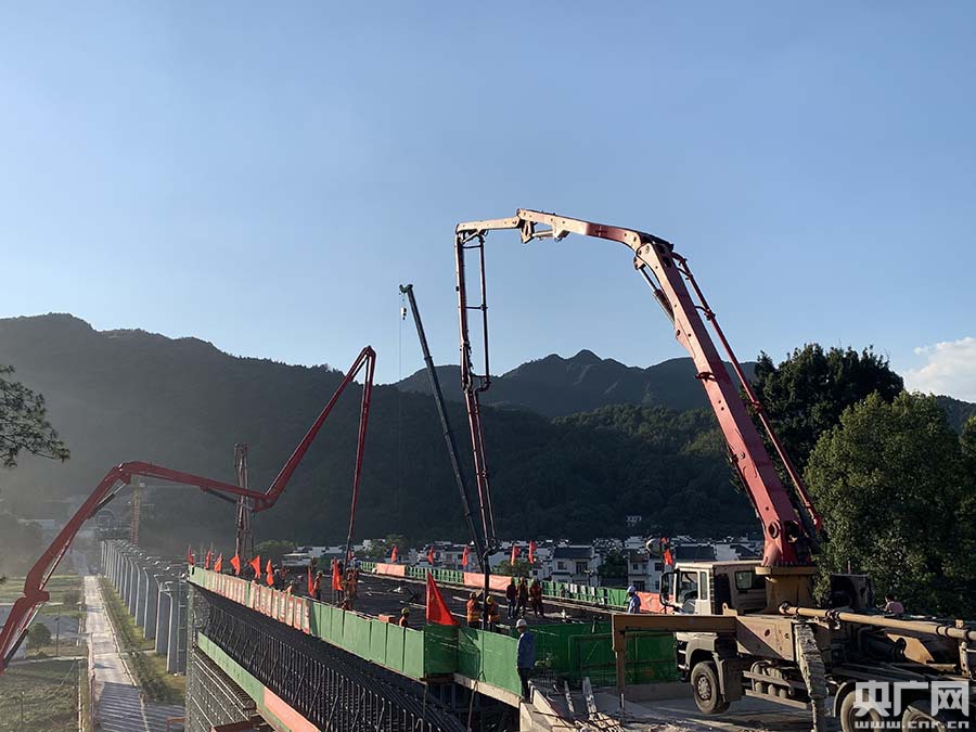 休寧河特大橋位于安徽省休寧縣境內(nèi),是昌景黃鐵路全線重要控制性工程之一。此次施工的橋梁上跨205國(guó)道,梁面跨度64米、寬12.6米,是目前國(guó)內(nèi)在建最大跨度高速鐵路現(xiàn)澆簡(jiǎn)支梁。